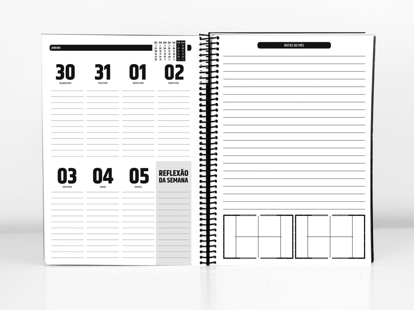 ✦ MATERIAIS: Acrílico Preto 4mm; Mola metálica com rebites; Película whiteboard de alta qualidade; Caneta Whiteboard; Design personalizado, Papel IOR; Capas plastificadas; Espiral metálica; Design personalizado