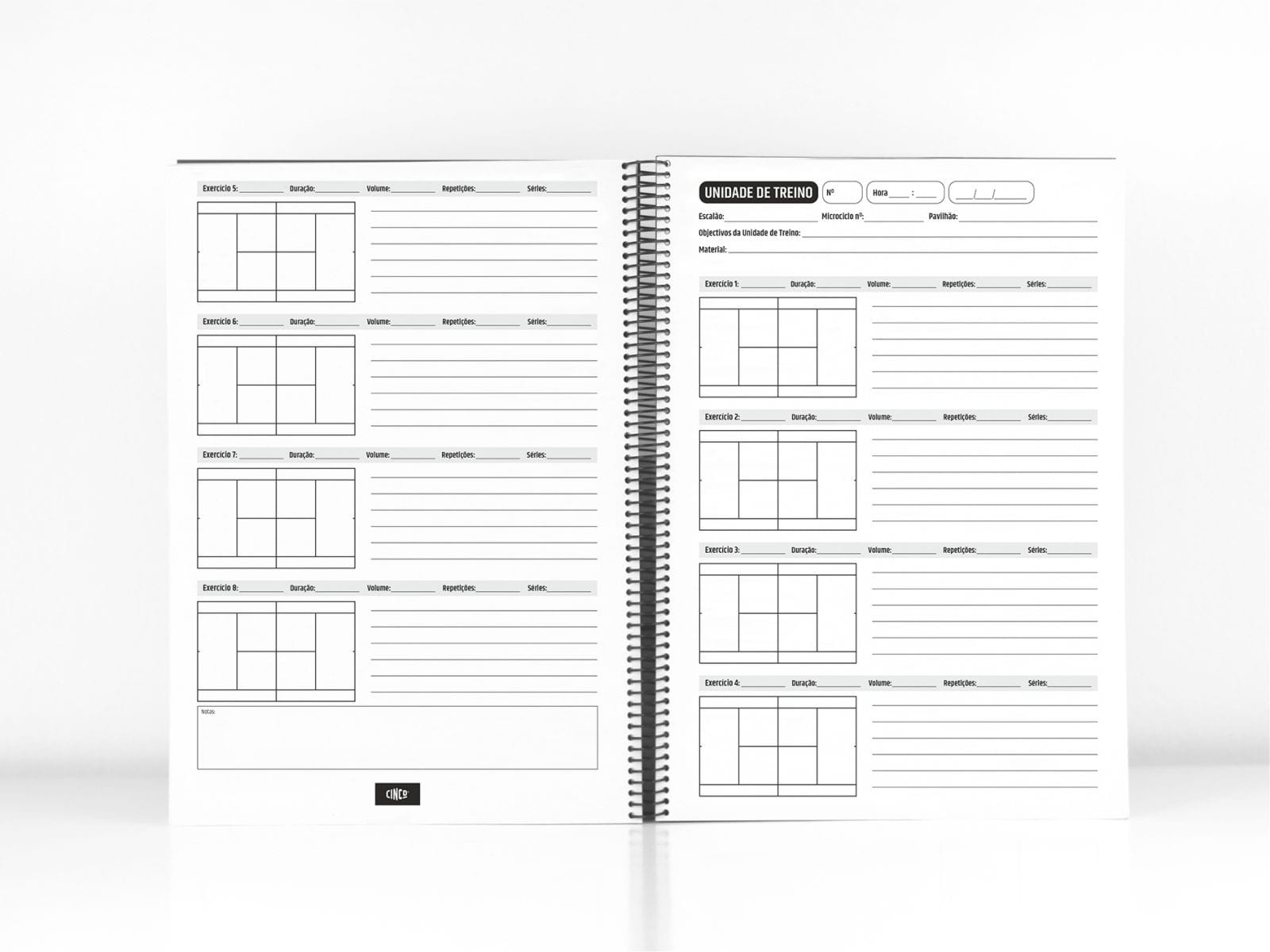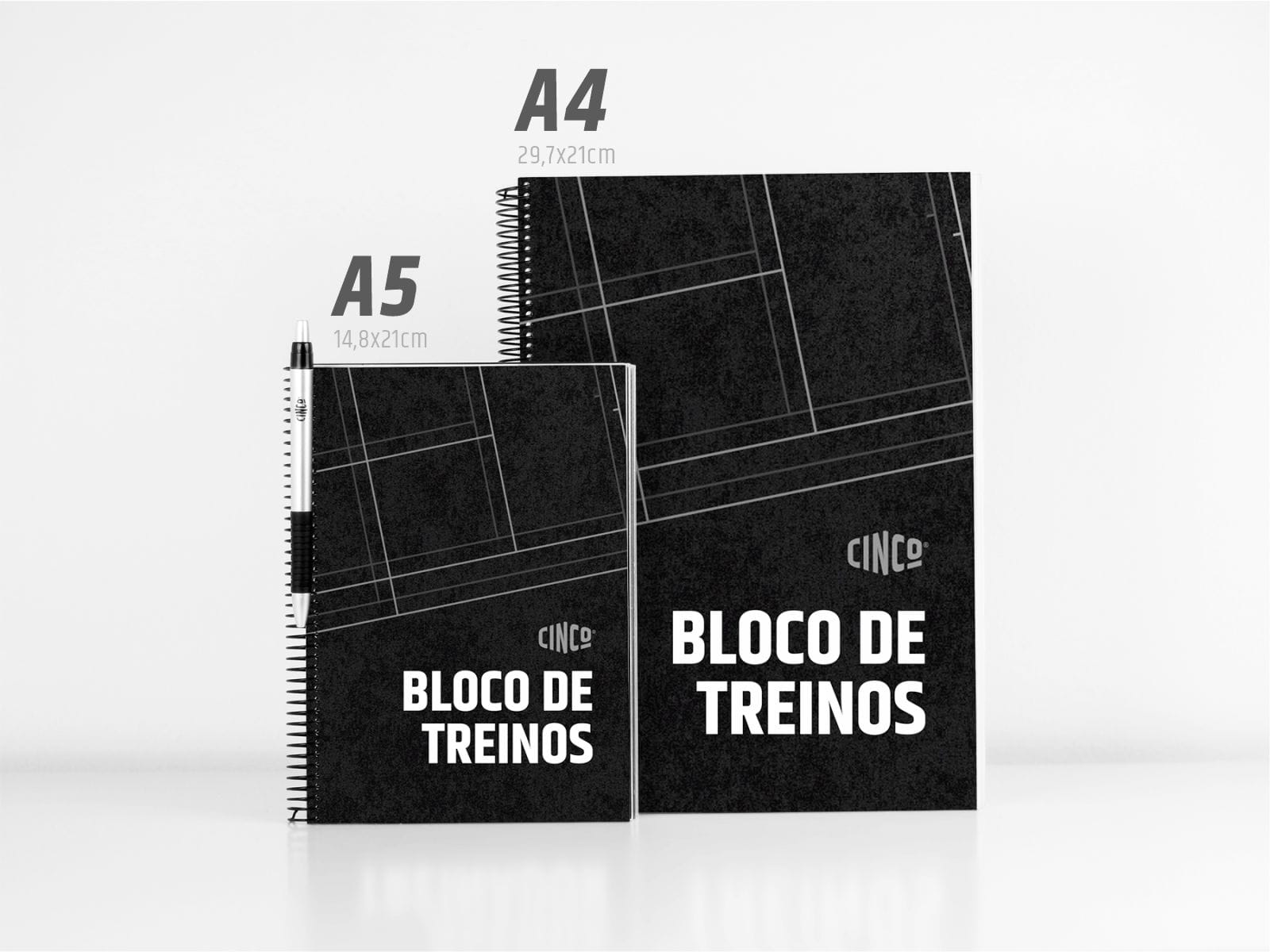 – Bloco Treinos: A5 14,8x21cm | A4 21×29.7cm | +/-2cm de espessura