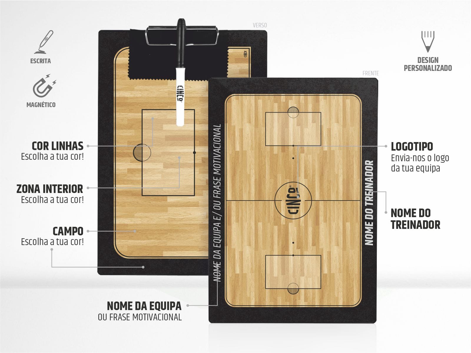 Para momentos especiais! Esta Clipboard magnética foi desenvolvida para te acompanhar em todos os momentos especiais da tua época. Com três tamanhos disponíveis, POCKET (15,5x22cm), GAME (22x32cm) e GO BIGGER (26×38cm) a Clipboard pode ser totalmente personalizada com o nome do treinador, logo da equipa, cores preferenciais e frase motivacional. Leva as tuas táticas para um novo nível! Encomenda já e desenha o teu sucesso!