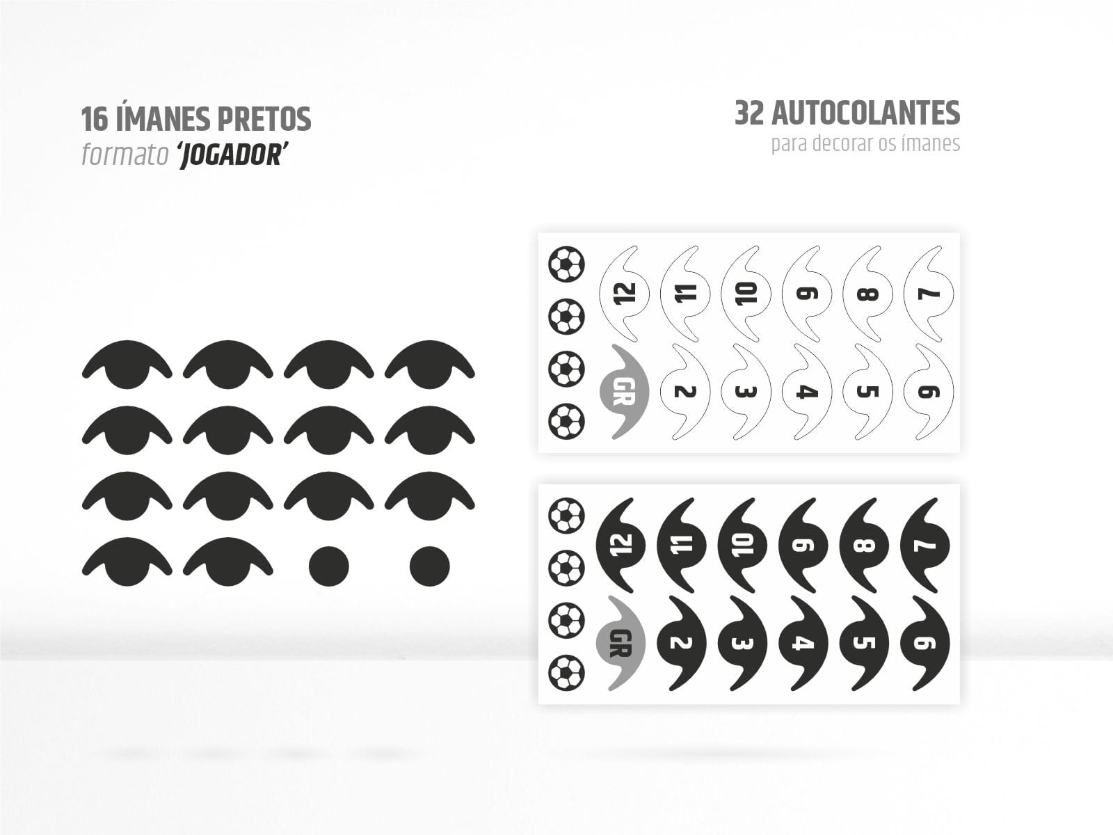 Inclui 14 ímanes formato ‘jogador’ pretos com 1,5cm de altura + 2 ímanes redondos com 1cm de diâmetro.