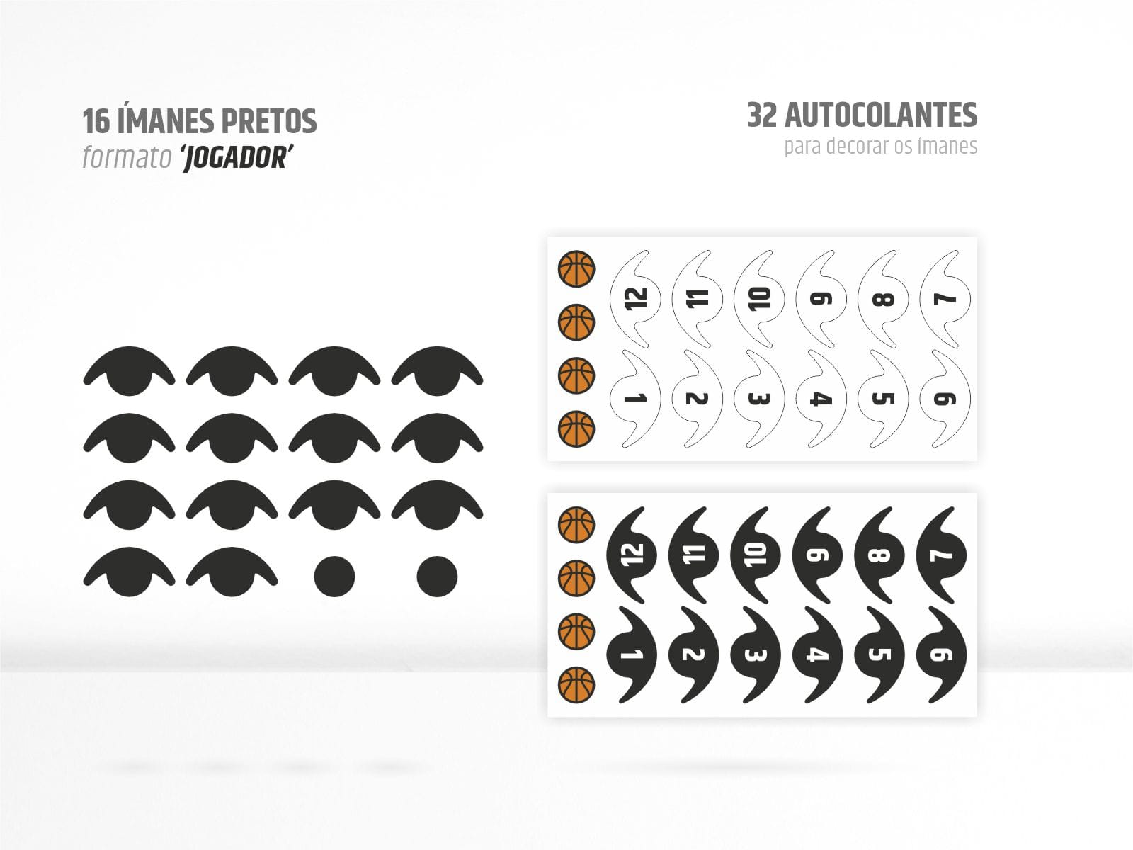 Inclui 14 ímanes formato ‘jogador’ pretos com 1,5cm de altura + 2 ímanes redondos com 1cm de diâmetro.